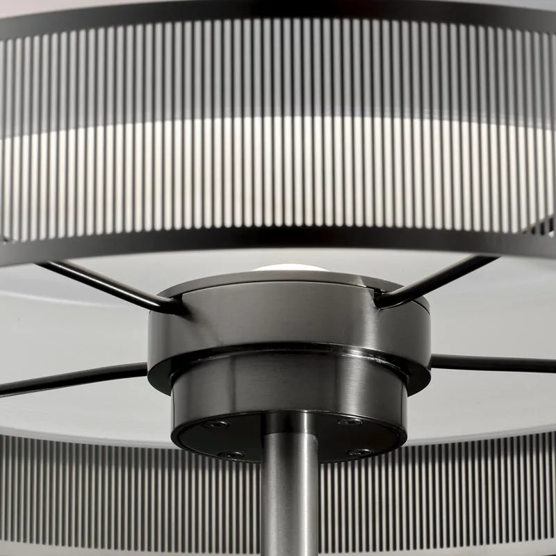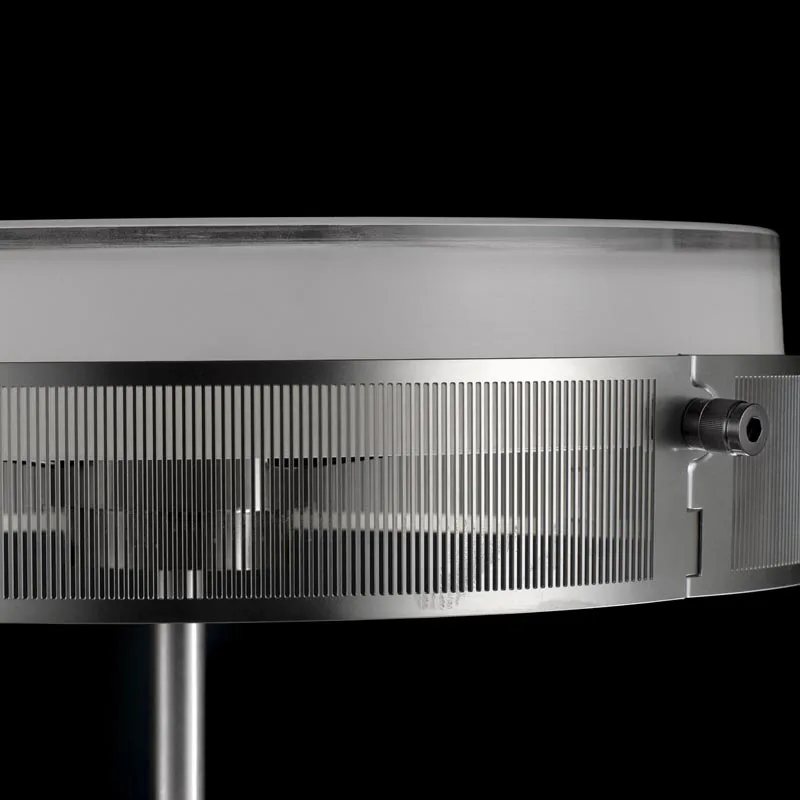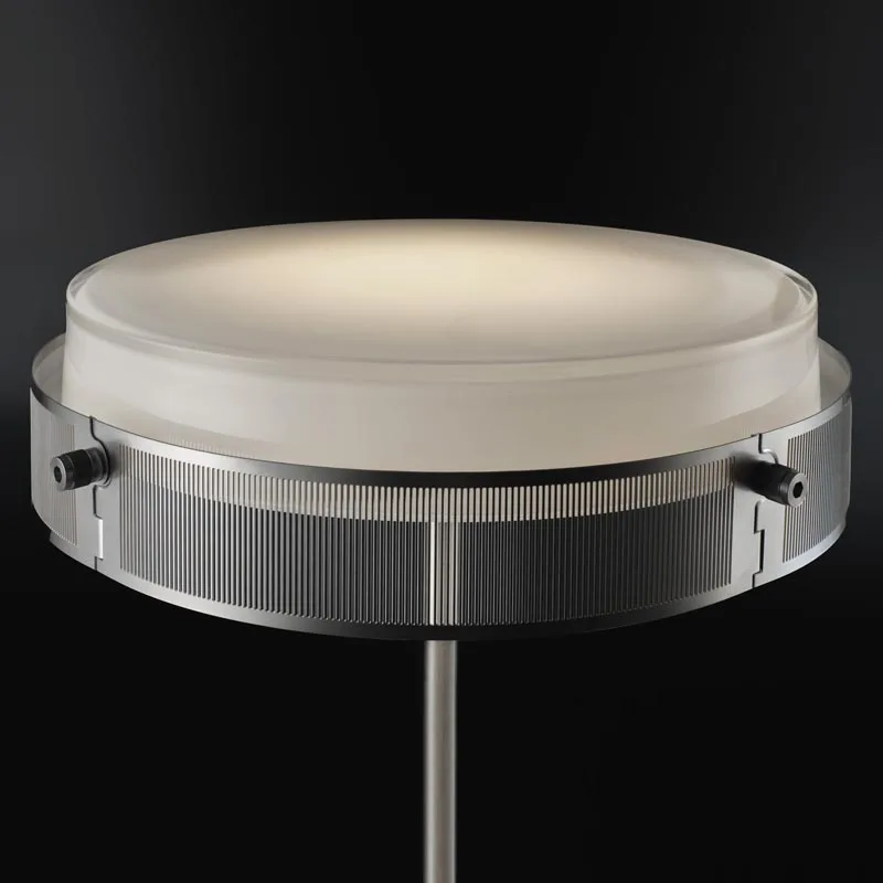 Die Hauptstruktur der Lampe besteht aus gedrehtem Aluminium, das eine LED-Einheit mit speziell entwickelter Optik beherbergt. Der Schirm aus Opalinglas streut das Licht sanft und sorgt für eine angenehme, komfortable Beleuchtung. Umrahmt wird der Leuchtkörper von vier Elementen aus foto-geätztem Edelstahl, die für eine filigrane und elegante Optik sorgen.