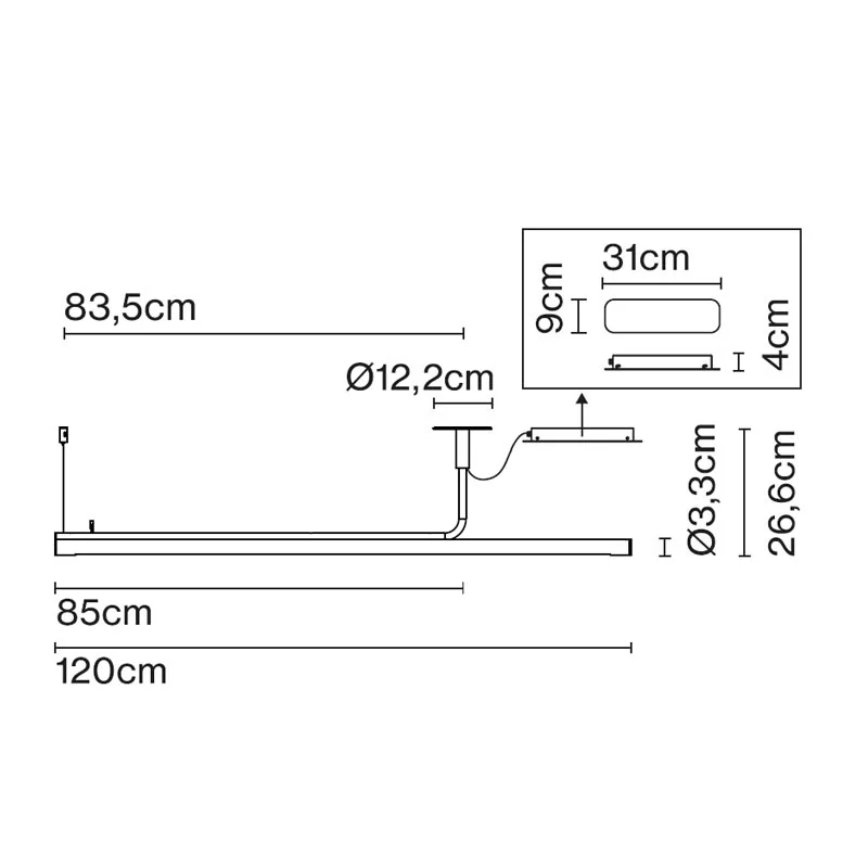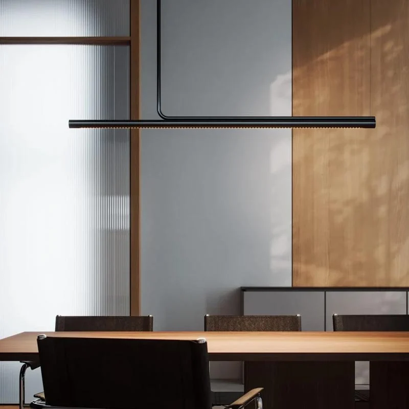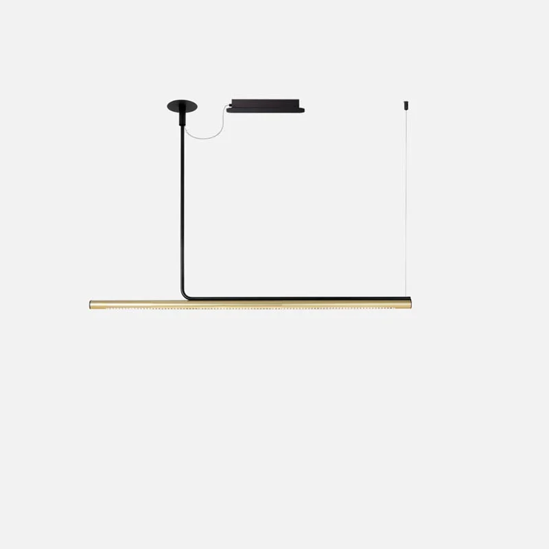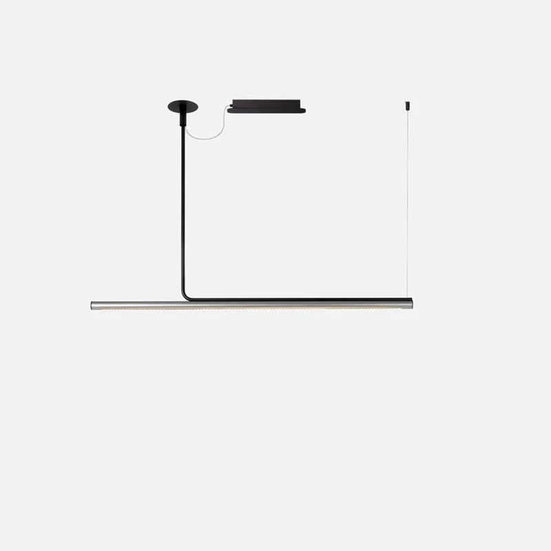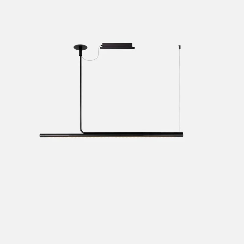 Der filigrane Leuchtenkörper aus eloxiertem Aluminium ist auf der Unterseite mit einer durchgehenden Reihe spezieller LED-Linsen ausgestattet, die das Licht gezielt und gleichmäßig nach unten abstrahlen. Die charakteristische, schwarz ausgeführte Metallstruktur mit 90°-Abwinkelung verleiht der Leuchte eine leichte, schwebende Anmutung und wird durch einen unauffälligen Zugdraht stabilisiert.