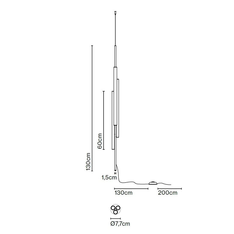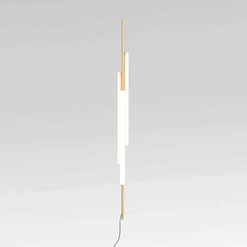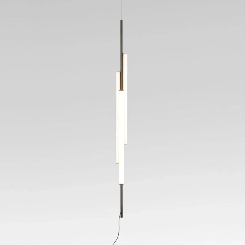 Drei leuchtende Röhren aus weißem Methacrylat sind versetzt an einer filigranen Aluminiumstruktur angeordnet. Diese bewusste Asymmetrie verleiht der Leuchte Leichtigkeit und eine skulpturale Wirkung, während das Licht gleichmäßig, weich und blendfrei in den Raum abgegeben wird.