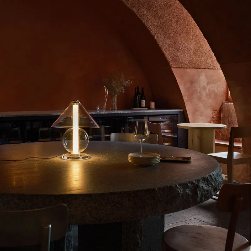 “Fragile” ist eine Brücke zwischen Vergangenheit und Gegenwart. Sie erinnert an alte Öllampen oder Kerzen, die von unten leuchten, und unterstreicht gleichzeitig die flüchtige Schönheit des Glases. Dieses Design huldigt der langen Geschichte der Tischleuchten, wobei die gläserne Variante durch ihre feinen Konturen den Betrachter erneut fesselt.