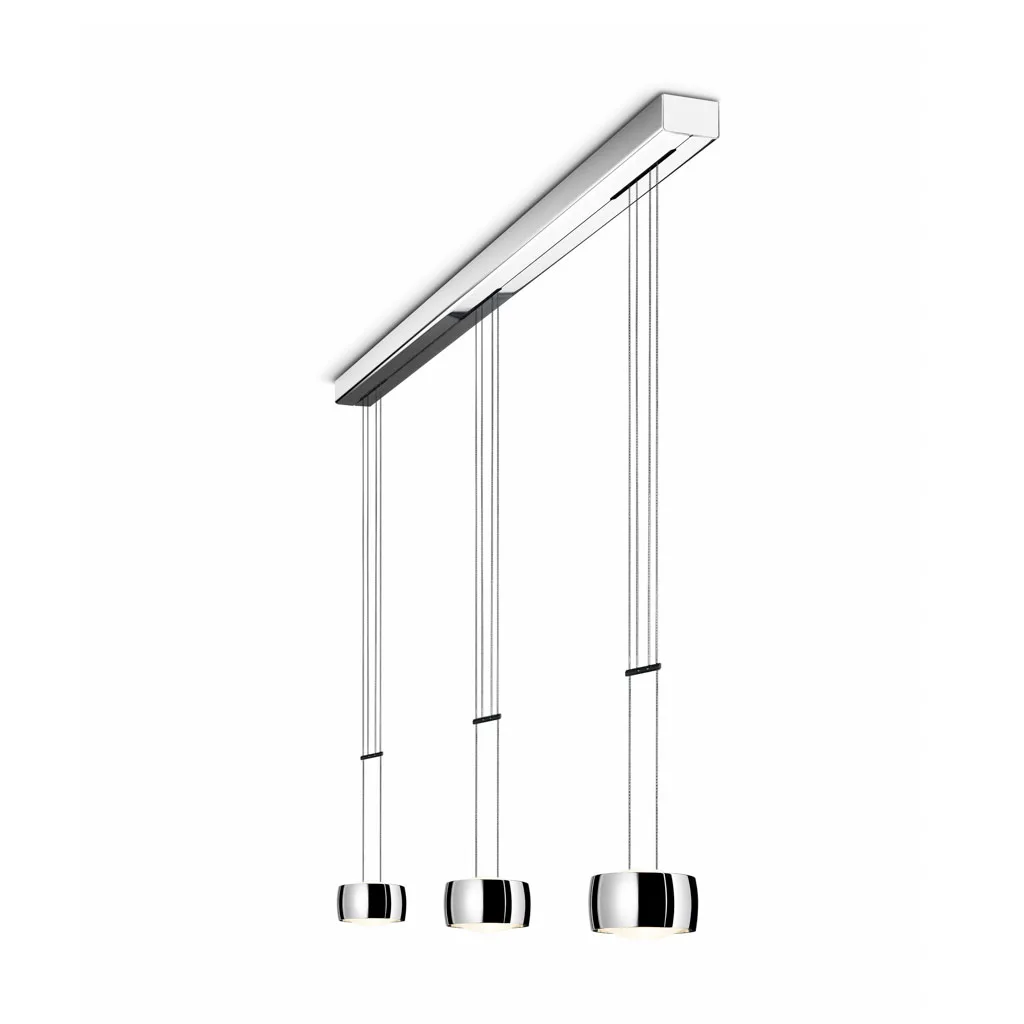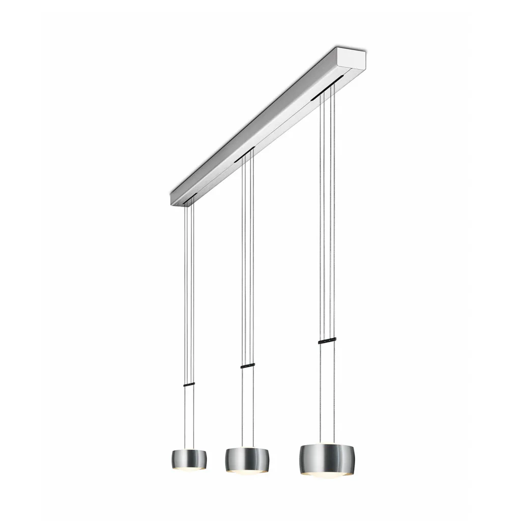 Das von Ralf Keferstein entworfene Design besticht durch eine Kombination aus edlen Metallringen und linsenförmigen, satinierten Glasschalen. Diese ermöglichen eine elegante Lichtwirkung nach oben und unten und schaffen ein stimmiges Gesamtbild. Die höhenverstellbare Aufhängung (stufenlos zwischen 160 cm und 200 cm) passt sich flexibel an individuelle Raumgegebenheiten an.