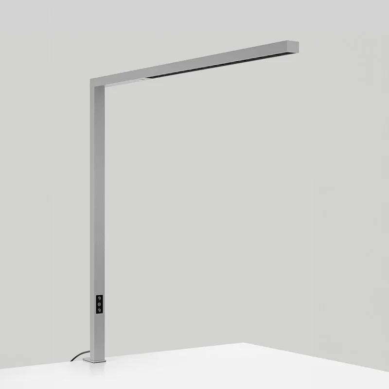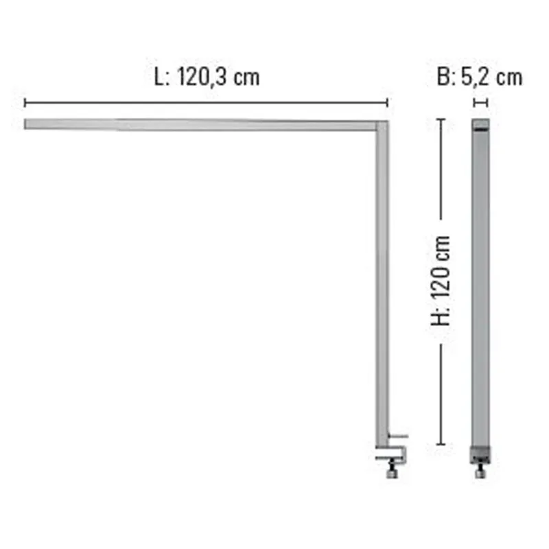 Der schlanke Leuchtenkopf (120,3 cm x 5,2 cm) wirkt wie ein eleganter Ausleger über dem Schreibtisch. Das direkte Licht leuchtet die Arbeitsfläche präzise aus, während der indirekte Lichtanteil von der Decke reflektiert wird und für eine gleichmäßige Grundhelligkeit im Raum sorgt. Beide Lichtquellen lassen sich individuell steuern, so dass sich die Beleuchtung ganz nach Bedarf einstellen lässt. Die Montage ist einfach und platzsparend: Die Leuchte wird mit den mitgelieferten Klemmschrauben direkt auf der Schreibtischplatte befestigt – so bleibt der Boden frei von Kabeln und Stützen.