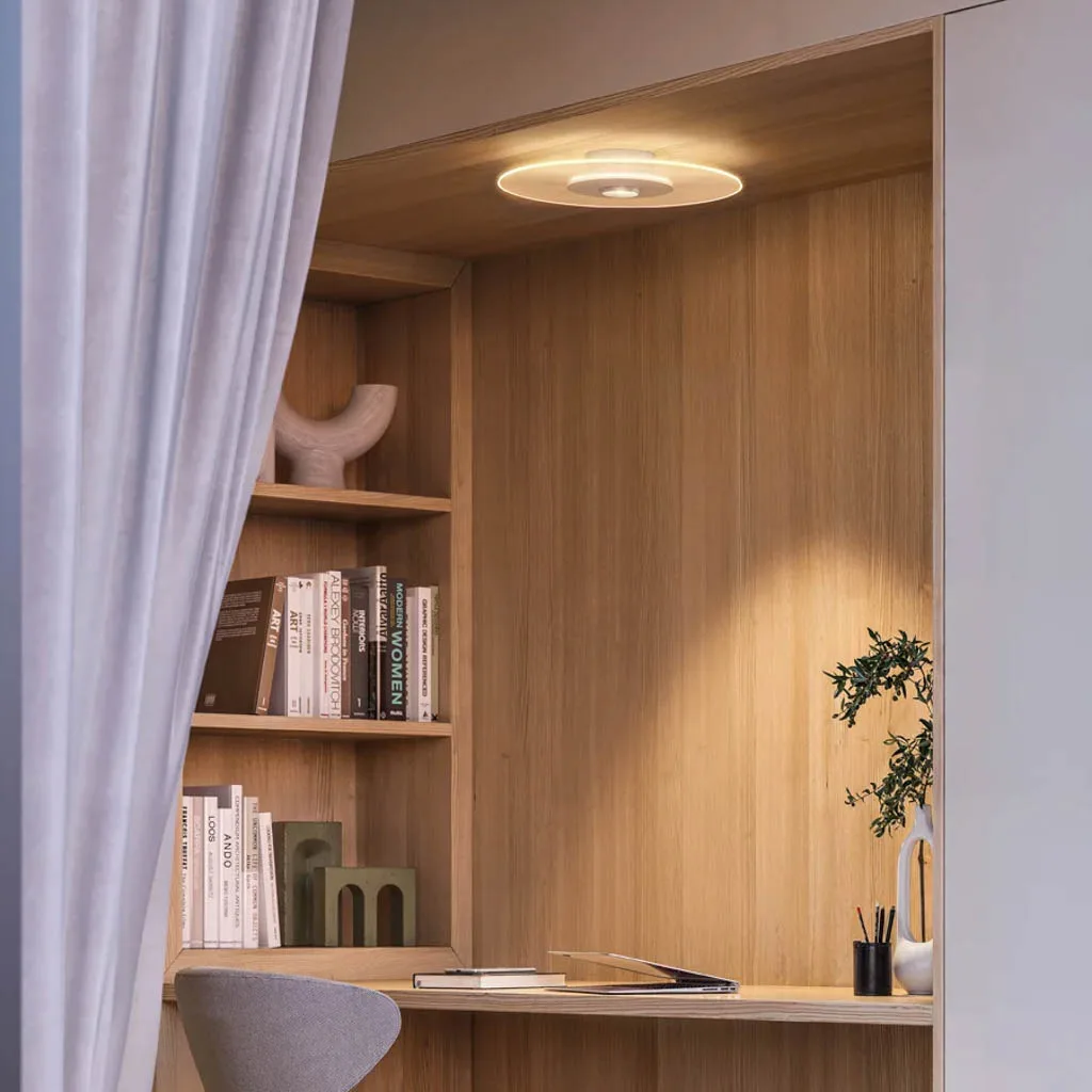 Die Dizco Deckenleuchte erzeugt eine ausgewogene Lichtstimmung, die sowohl funktionale als auch atmosphärische Anforderungen erfüllt: