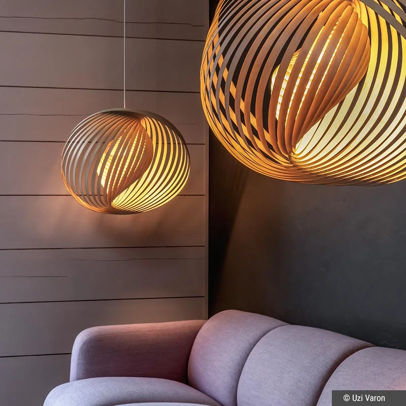 Das Licht wird sanft durch die Holzlamellen gefiltert und erzeugt eine warme, blendfreie Beleuchtung mit einer besonders wohnlichen Ausstrahlung. Gleichzeitig betont die Lichtführung die raffinierte Geometrie der Leuchte und unterstreicht ihre schwebend leichte Anmutung.