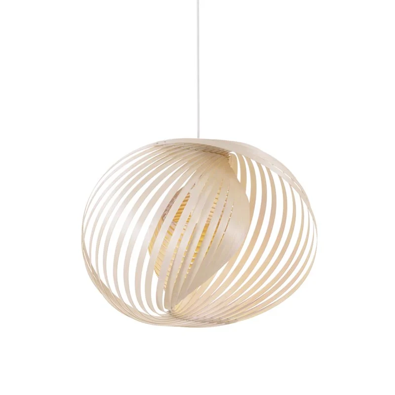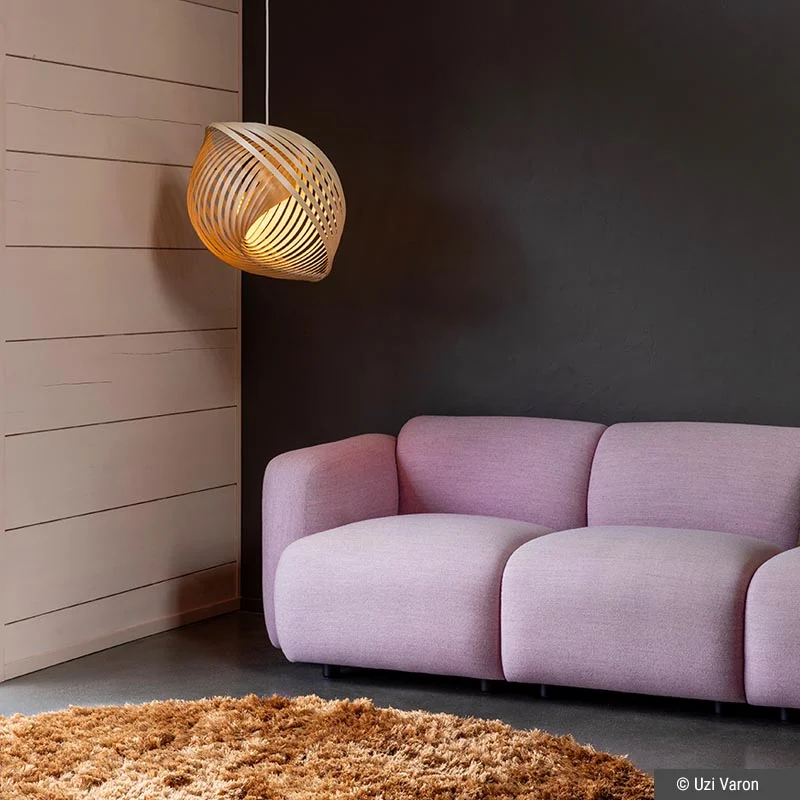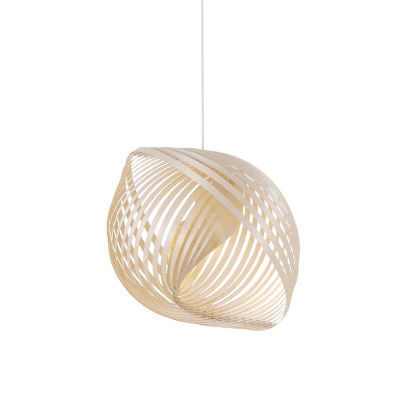 Der asymmetrisch geformte Schirm besteht aus außergewöhnlich feinen Lamellen aus Birken-Sperrholz. Diese sind so filigran gearbeitet, dass sie sich mühelos in eine organisch gerundete Form biegen lassen. Der gestalterische Kern der Leuchte liegt in der Idee der Transformation: Ausgehend von einer nahezu flachen Struktur entfaltet sich der Schirm zu einem komplexen, dreidimensionalen Körper. Die zarten Holzspeichen formen eine skulpturale Struktur, die sich je nach Blickwinkel immer wieder neu präsentiert und Innen- und Außenform fließend miteinander verbindet.