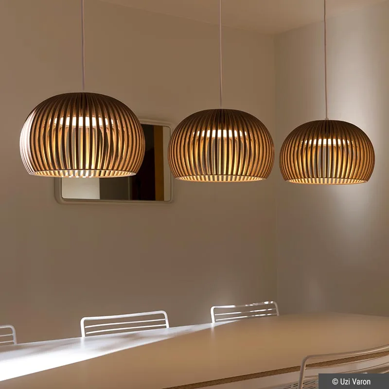 Das kompakte Design der Atto 5000 zeichnet sich durch eine angenehme Zurückhaltung aus, die dennoch eine starke Präsenz vermittelt. Das offene Design der Leuchte schafft eine erstaunliche Leichtigkeit, die es ihr ermöglicht, sich harmonisch in verschiedene Umgebungen einzufügen – von gemütlichen Wohnzimmern, modernen Besprechungszimmern bis hin zu stilvollen Cafés und eleganten Restaurants. Der besondere Charme dieser Pendelleuchte liegt in ihrer warmen und natürlichen Ausstrahlung. Verfügbar in verschiedenen Farbnuancen, passt sie sich nahtlos an unterschiedliche Einrichtungsstile an und bereichert jedes Ambiente.