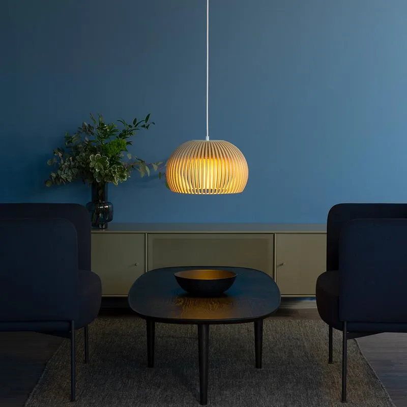 Der Birkenholzschirm ist nicht nur optisch ansprechend, sondern spielt auch eine entscheidende Rolle in der Lichtgestaltung. Er verteilt das Licht auf eine einzigartige Weise: Während das Hauptlicht direkt nach unten strahlt, entweichen sanfte Lichtstrahlen durch die feinen Öffnungen im Schirm, wodurch faszinierende Lichtmuster entstehen und ein weiches, einladendes Ambiente kreiert wird.