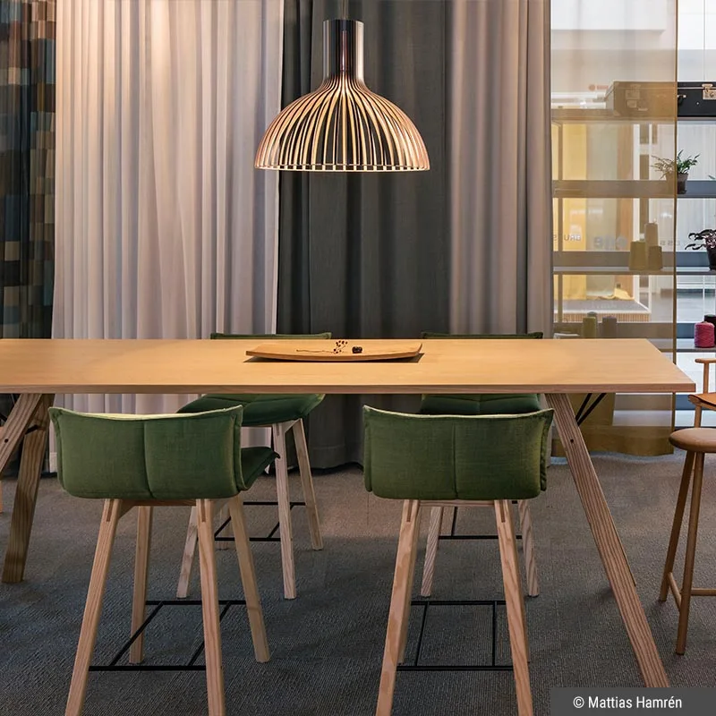 Die Victo 4250 eignet sich perfekt als zentrales Statement-Stück oder in Kombination mit anderen Leuchten der Secto Kollektion. Sie entfaltet ihre Wirkung sowohl in privaten Räumen als auch in öffentlichen Bereichen, wo sie eine warme, einladende Atmosphäre schafft. Sie ist mehr als nur eine Lichtquelle; sie ist ein Stück Lebenskunst, das Funktionalität mit ästhetischer Schönheit verbindet und in jedem Raum eine beruhigende, einladende Atmosphäre schafft.