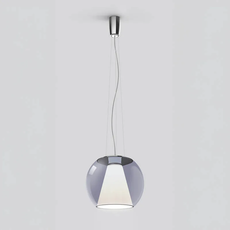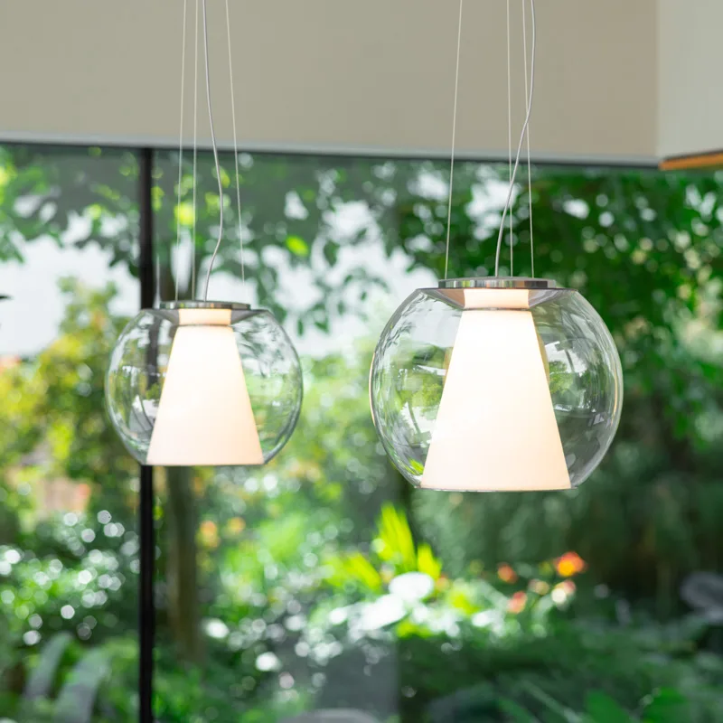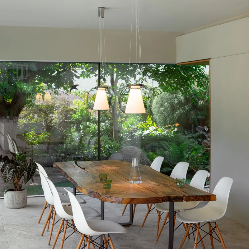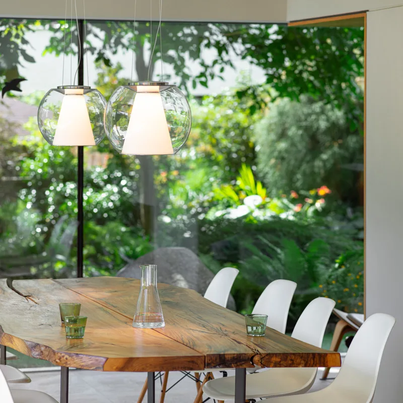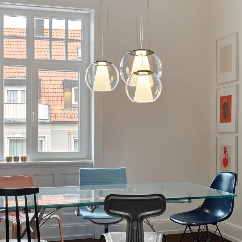 Draft Rope M ist in drei Farben erhältlich: klar, blau transparent und braun transparent. Das elegante Lichtobjekt verfügt über eine werkzeugfrei ausrichtbare Stahlseilabhängung (Rope), die sich ideal für tiefere Abhängungen, beispielsweise über dem Couchtisch, eignet.