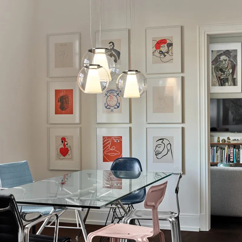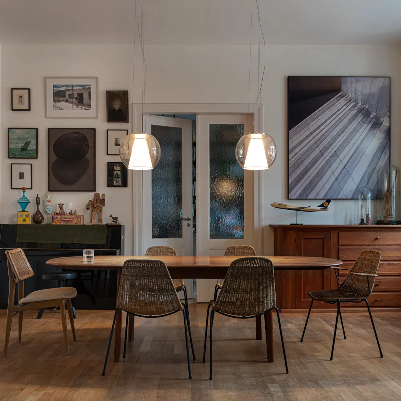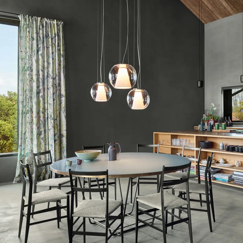Eine Gruppe von gestaffelt aufgehängten DRAFT Leuchten schafft einen beeindruckenden Leuchten-Cluster, der sich perfekt für Wohnräume, Esstische, Treppenaugen oder Foyers eignet. Für Mehrfachanbringungen an nur einem Deckenauslass sind passende Baldachine verfügbar.