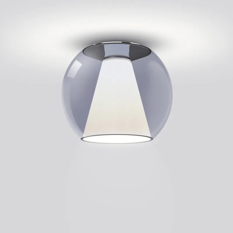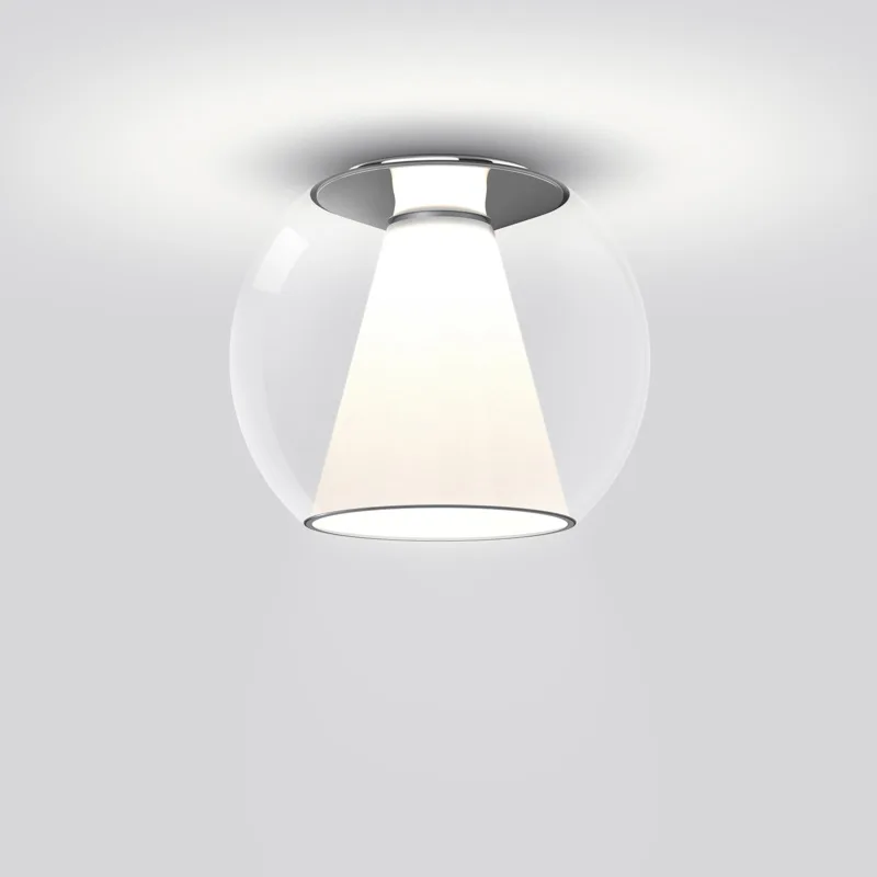 Die LED-Deckenleuchte DRAFT S von Serien Lighting verwandelt das traditionelle Konzept der Kugelleuchte in ein Zeichen zeitgenössischer Klarheit und ausgeglichener Lichtverteilung. Durch den spannenden Kontrast zwischen der transparenten, mundgeblasenen Glaskugel und dem matten, konischen Innenreflektor wird ein visuelles Erlebnis geschaffen. Das im Inneren des konischen Reflektors eingebettete LED-Leuchtmittel bietet sowohl sanft gestreutes Raumlicht als auch zielgerichtetes Licht nach unten. Die Diffusorscheibe sorgt dafür, dass das Licht besonders weich austritt und Flächen gleichmäßig beleuchtet werden.
