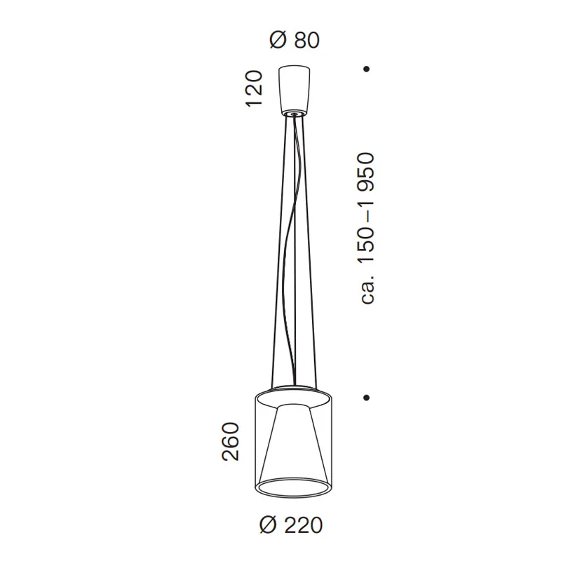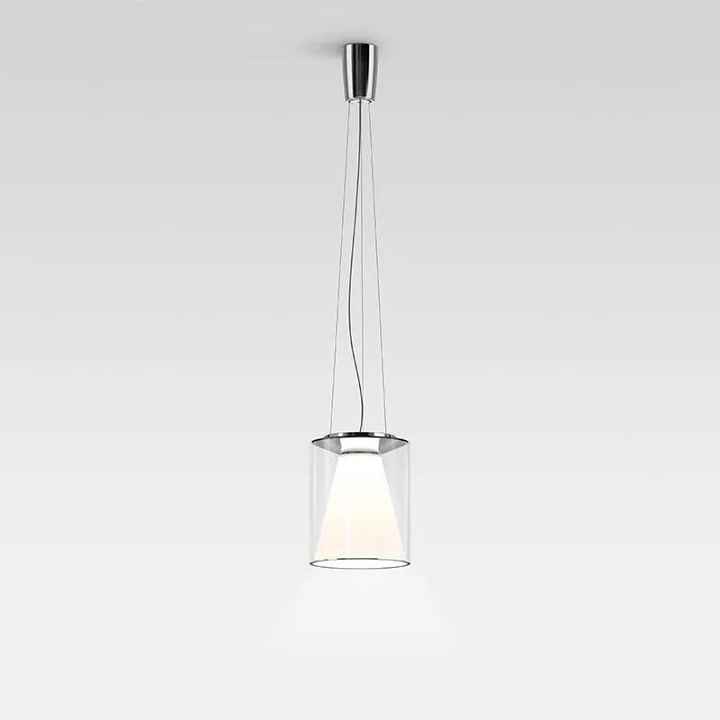 Die Konfiguration des opalen Innenreflektors variiert je nach Höhe und Durchmesser der transparenten äußeren Glasform. Diese Kombination erzeugt ein faszinierendes Zusammenspiel von klaren Zylindern und Kegeln mit unterschiedlichen Winkeln im Inneren. Mit ihrer feinen Edelstahl-Seilabhängung passt die Leuchte besonders gut über Tische, Tresen und Theken.