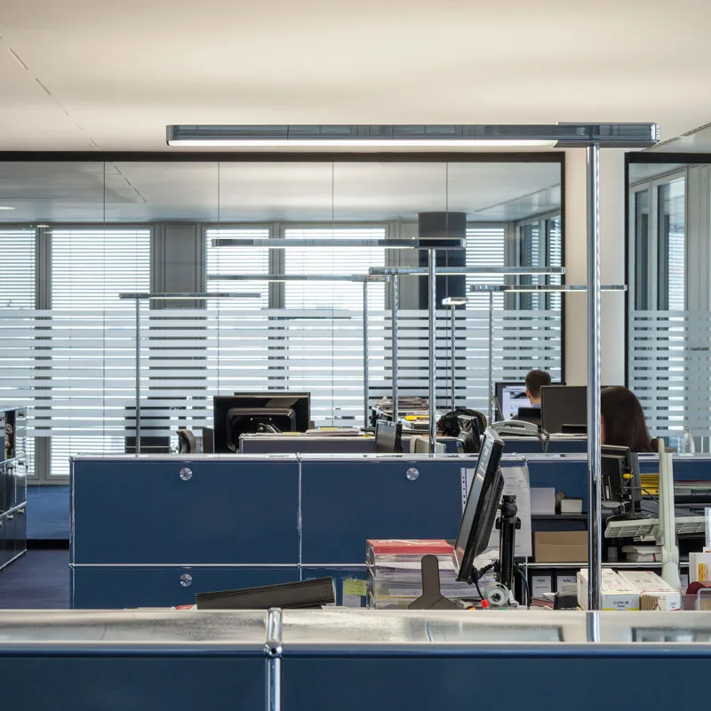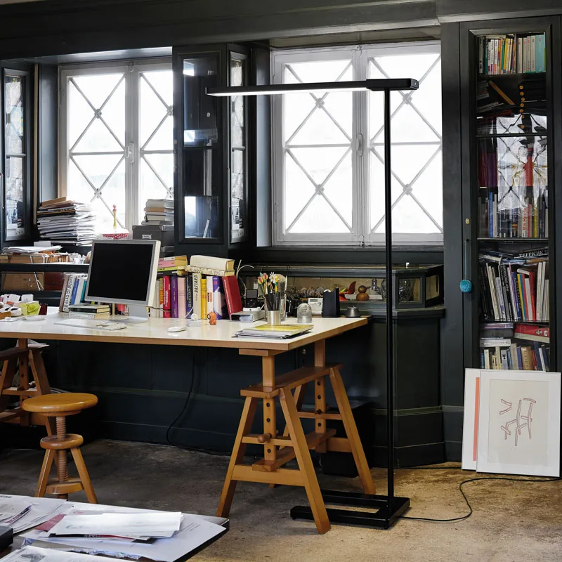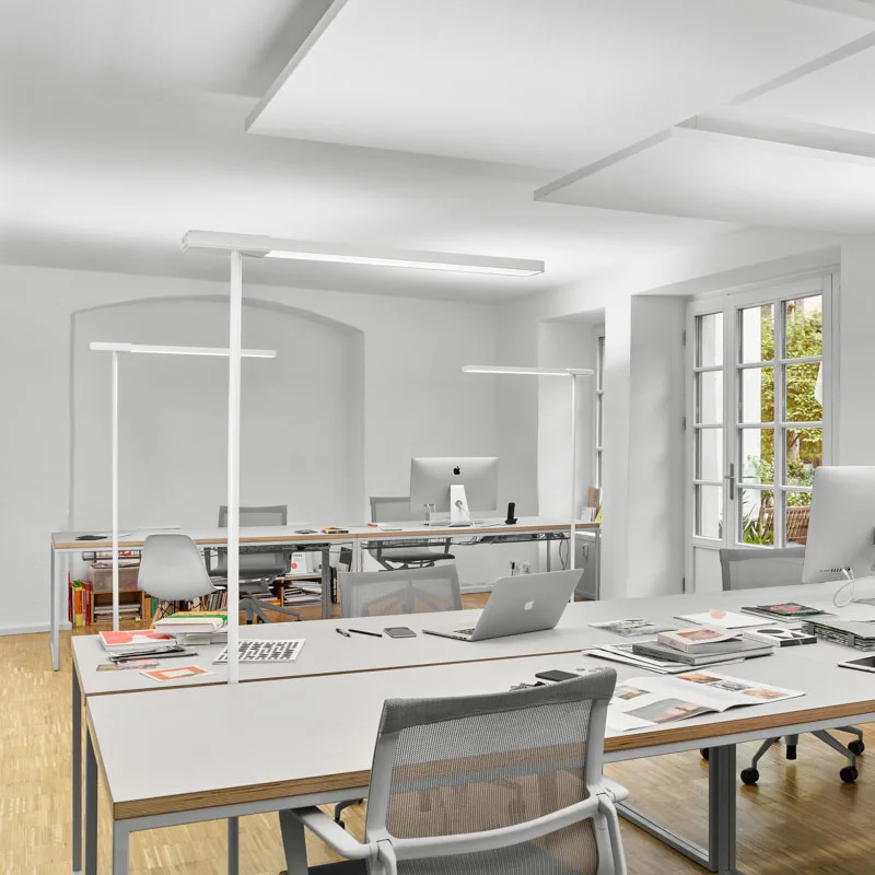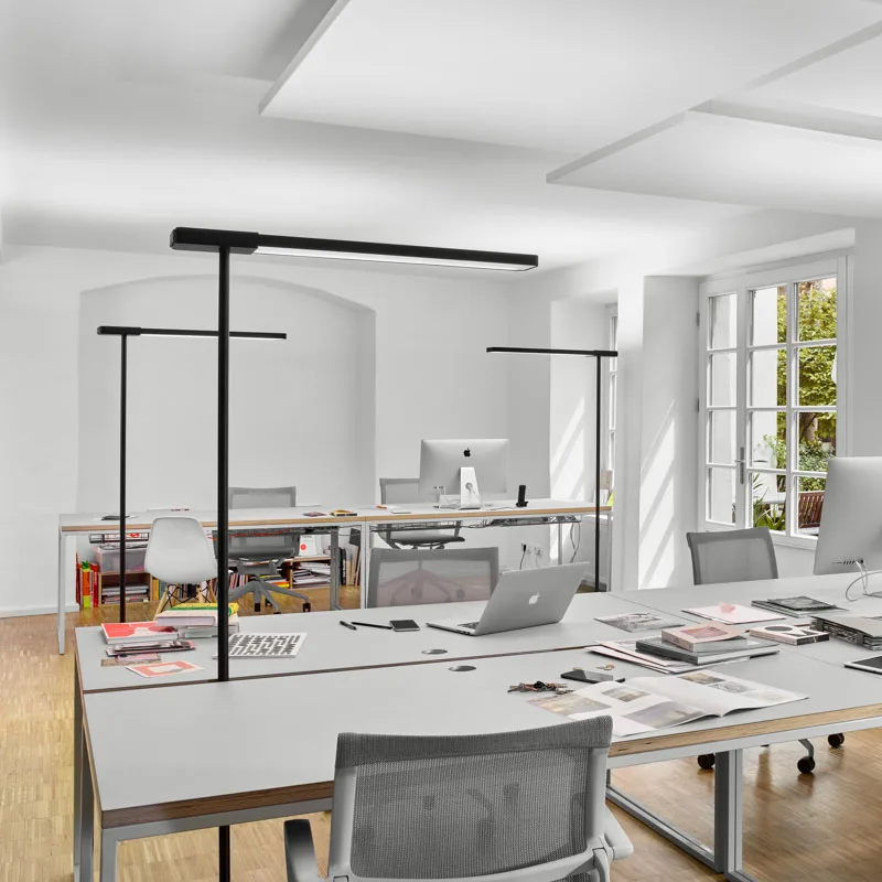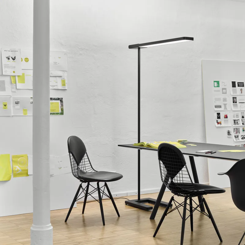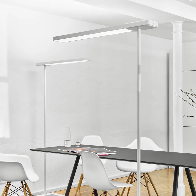 SLICE² ist eine technische, funktionale und formal ästhetische Weiterentwicklung der erfolgreichen SLICE. Ob zum Einsatz im Homeoffice, im Atelier oder dem Büro – SLICE² ist die perfekte Lichtlösung, die den Anforderungen an moderne Büroarbeitsplätze hinsichtlich Lichtleistung und Entblendung gerecht wird. Eine optimale Lichtwirkung wird durch die innovative Anordnung der Leuchtmittel auf zwei Ebenen in einem komplett geschlossenen Leuchtenkopf erzielt. Die breit nach oben strahlenden LED Streifen bieten indirektes und absolut blendfreies Licht – und das auch bei voller Leistung. Direktes Licht nach unten auf die Arbeitsfläche entsteht durch LED-Leuchtmittel, deren Licht über die Glaskanten eingespeist und von einer prismatischen Scheibe verteilt wird. Die moderne Arbeitsleuchte kann mit einer Farbtemperatur von 3000 oder 4000 Kelvin bestellt werden. Über einen Tastdimmer am Leuchtenkopf lässt sich die Lichtleistung ganz nach Bedarf an unterschiedliche Anforderungen anpassen. Alternativ ist SLICE² Floor auch mit Präsenz- und Tageslichtsensorik erhältlich.