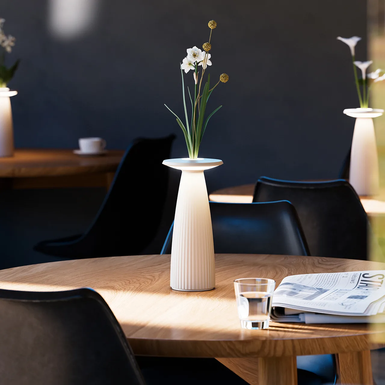 Formschöne LED-Akkuleuchte mit integrierter Blumenvase für stimmungsvolle Tischbeleuchtung in Innen- und Außenbereichen ✓  Bis zu 12 Stunden Leuchtdauer ✓ Touchdimmer ✓ Flex-Mood-Feature: Extra-Warmweiss 2.200 K + Warmweiss 2.700 K