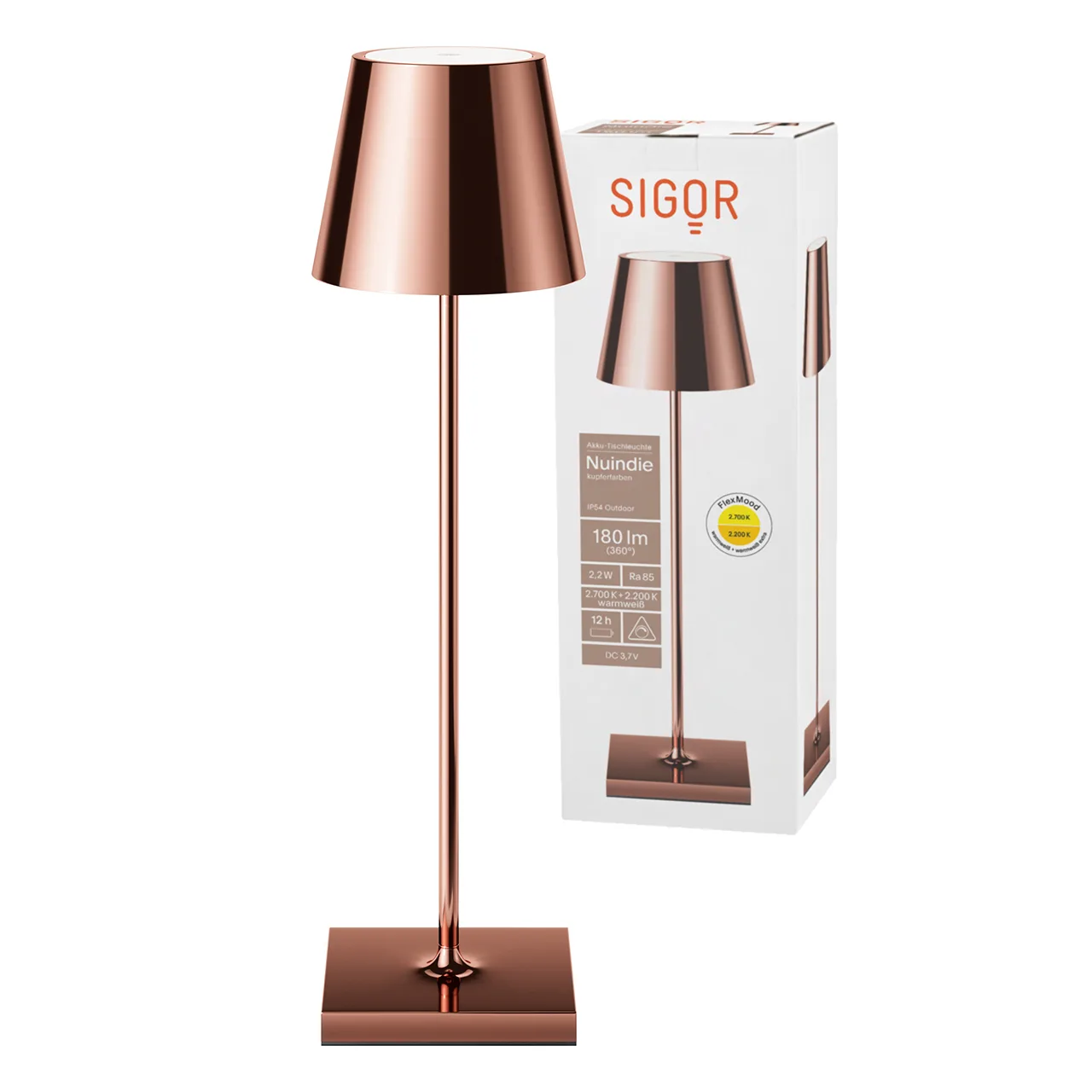 Sigor Nuindie LED-Akkutischleuchte in kupferfarben ✓ IP54 geeignet für den Außenbereich ✓ Lange Leuchtdauer dank leistungsstarkem Akku ✓ Einfach & Schnell Kaufen ✓ 45 Jahre Kompetenz ✓ Lampada.de