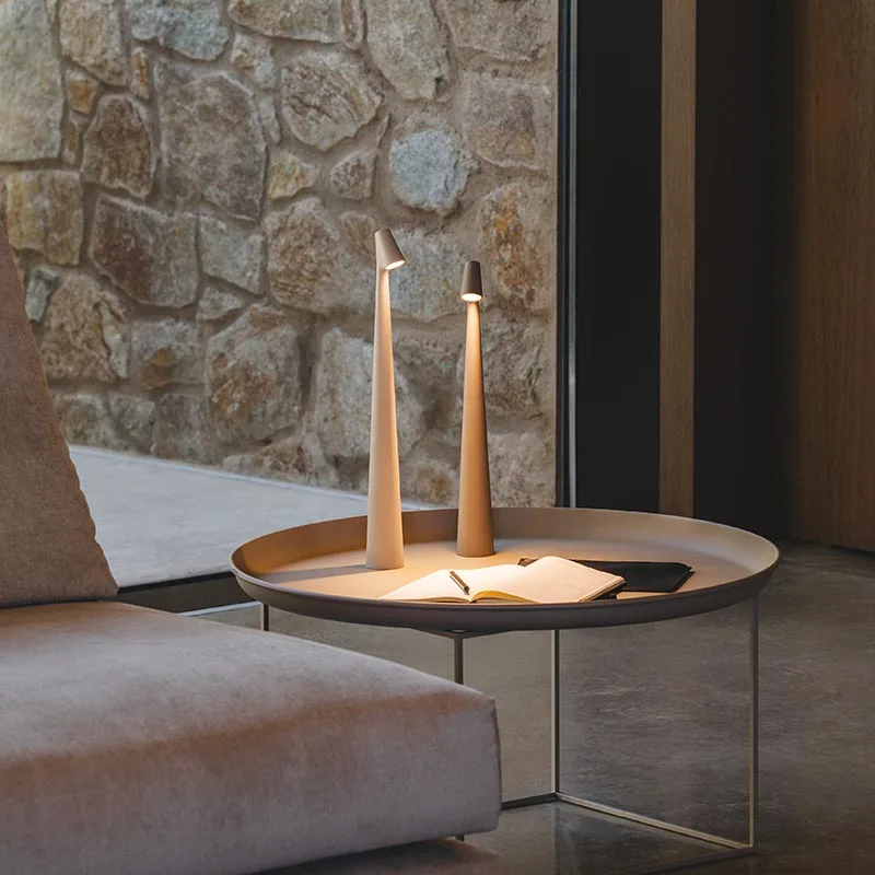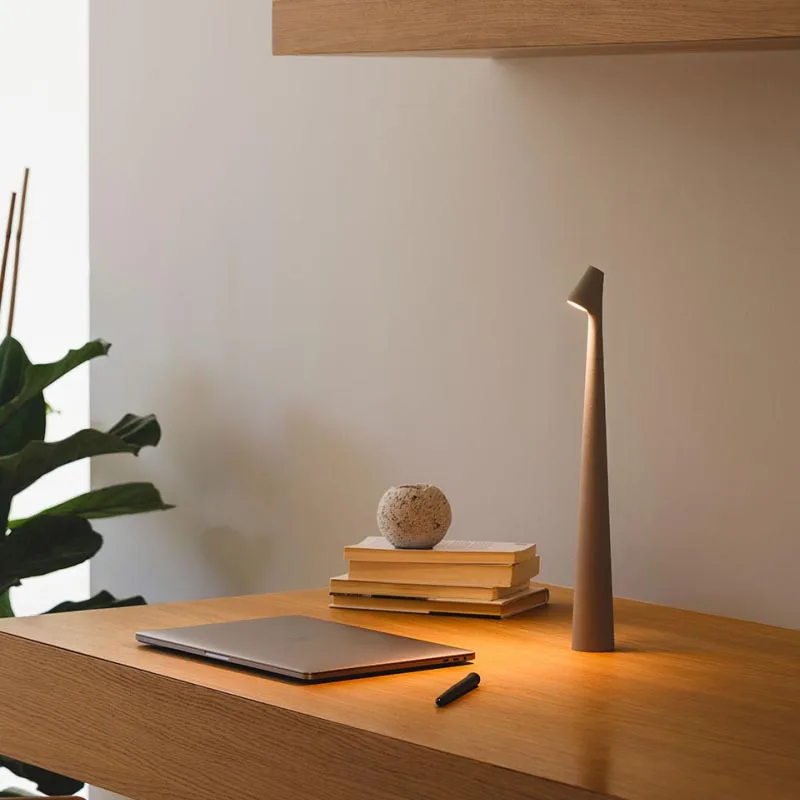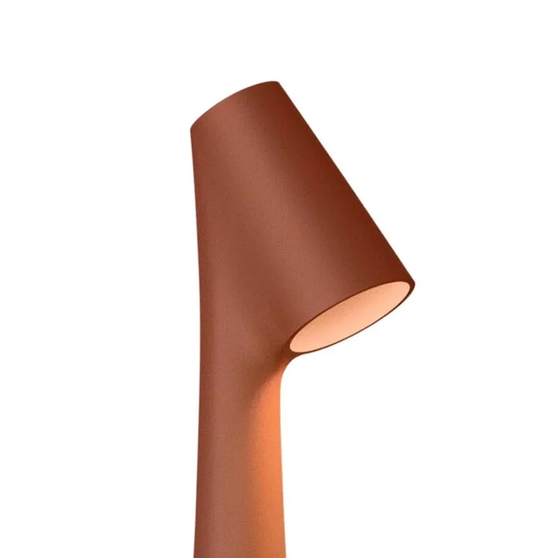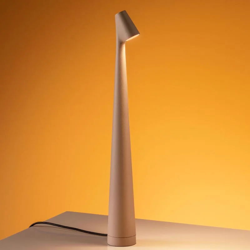 Das minimalistische Design definiert sich durch einen schlanken konischen Ständer, der in einen eleganten Kopfteil übergeht und förmlich dazu einlädt, um nach ihr zu greifen. Die in zwei Größen erhältliche Leuchte ist mit einer matten Lacktextur versehen, die in vier natürlichen Farbtönen erhältlich ist und dem Design Wärme und Präsenz verleihen.