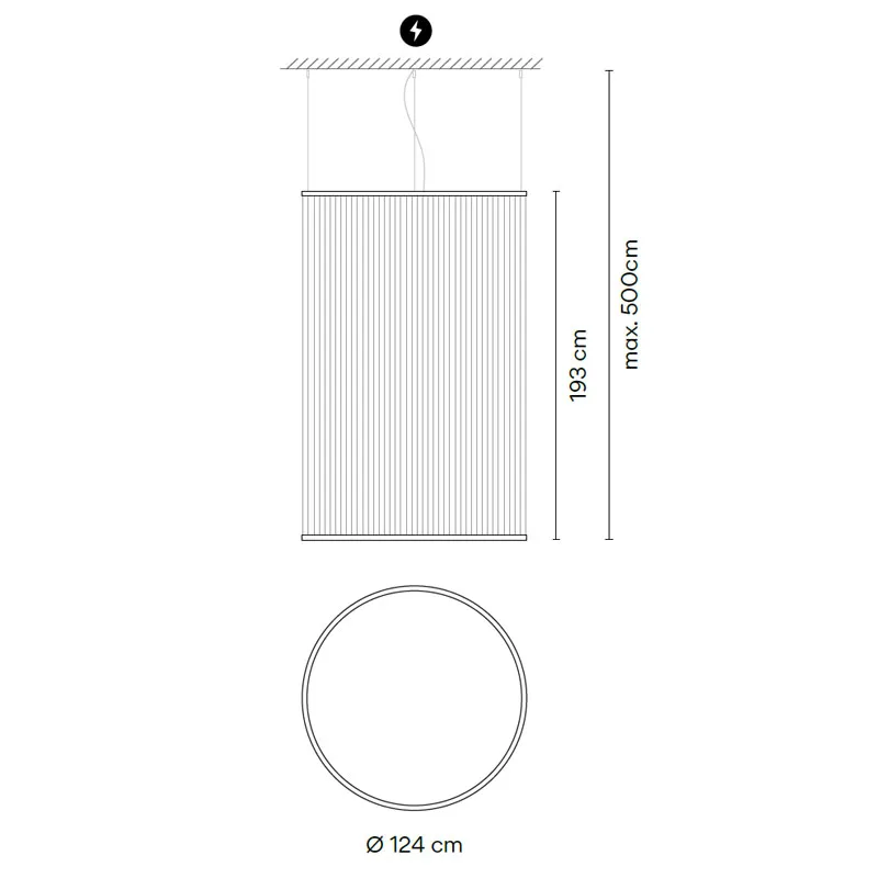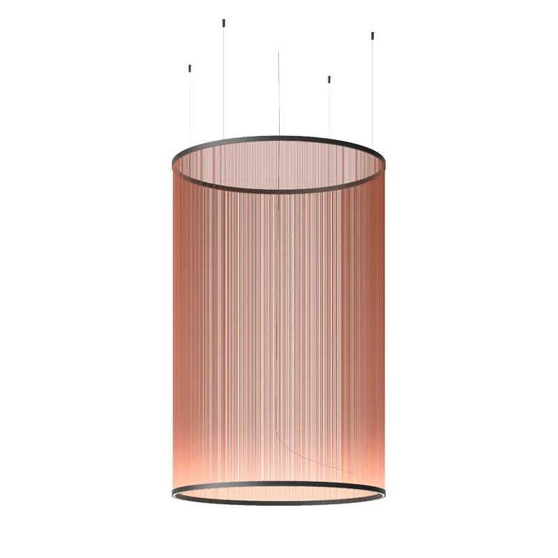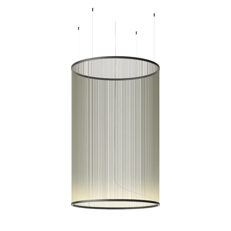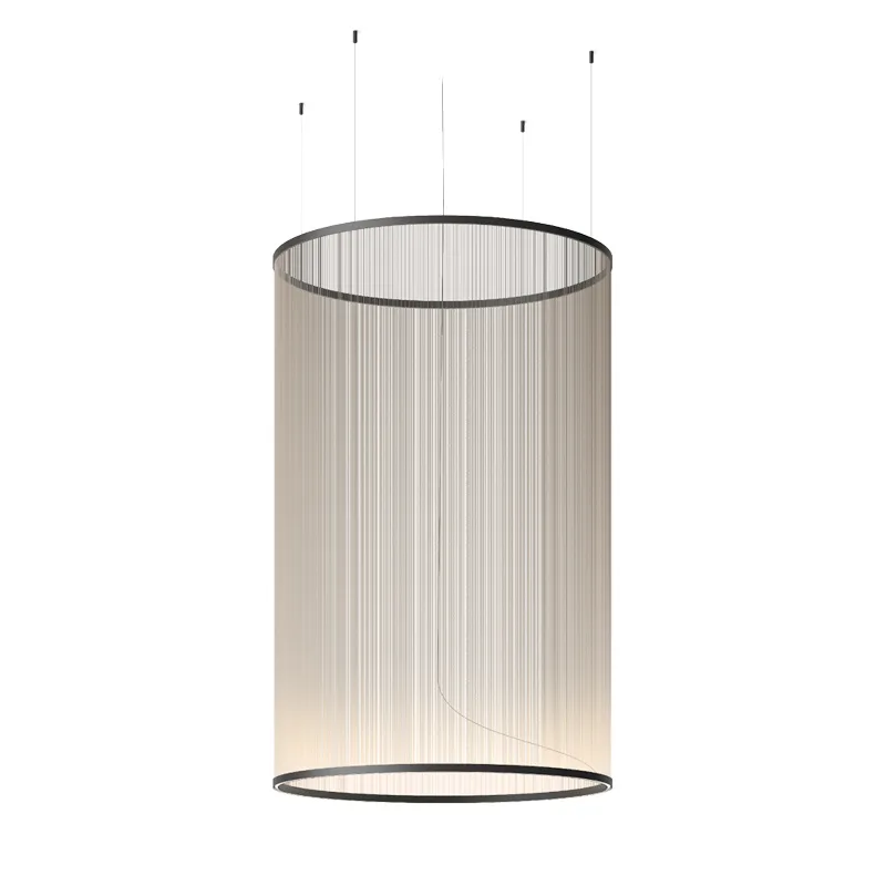 Vibia Array 1845 ist eine imposante Pendelleuchte, die mit einem Durchmesser von 124 cm und einer Schirmhöhe von 193 cm zum Blickfang in allen Räumen wird. Entworfen vom Designer Umut Yamac, besticht sie durch einen zylindrischen Leuchtenschirm aus fein gesponnenen Fäden, der eine einzigartige Leichtigkeit und dynamische Komplexität ausstrahlt.
