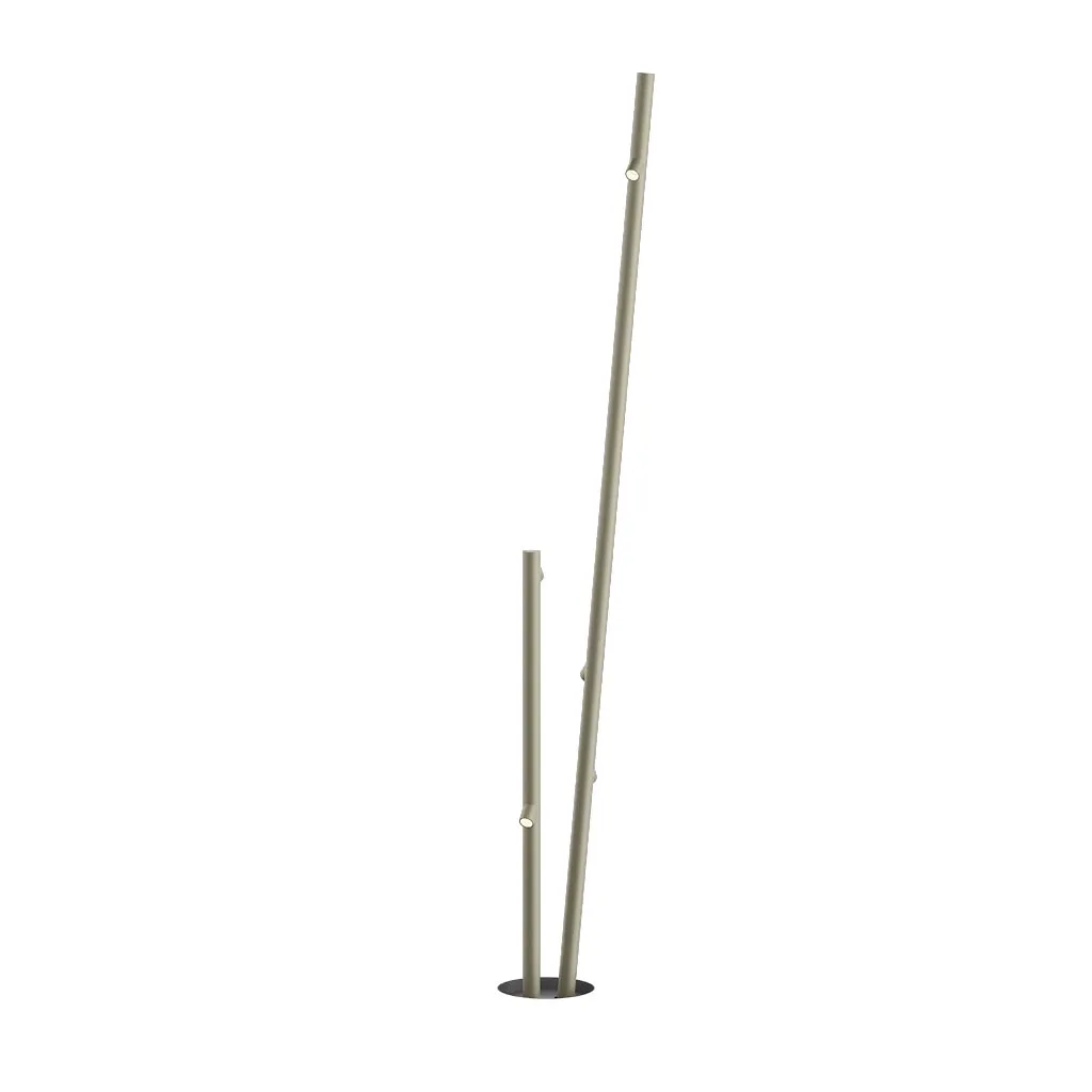 Das minimalistische, von Bambus inspirierten Design integriert sich nahtlos in grüne Außenanlagen und architektonische Landschaften. Die dünnen, röhrenförmigen Leuchtenkörper mit einem Durchmesser von nur 4 cm und unterschiedlich langen Lichtquellen erzeugen eine lebendige, natürliche Optik. Die Mehrfachvariante mit zwei Stäben verstärken diesen Eindruck und wirken wie natürlich gewachsene Pflanzen.
