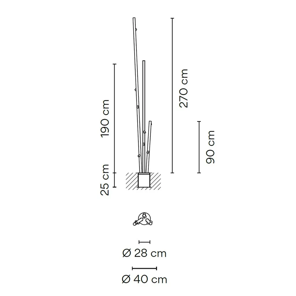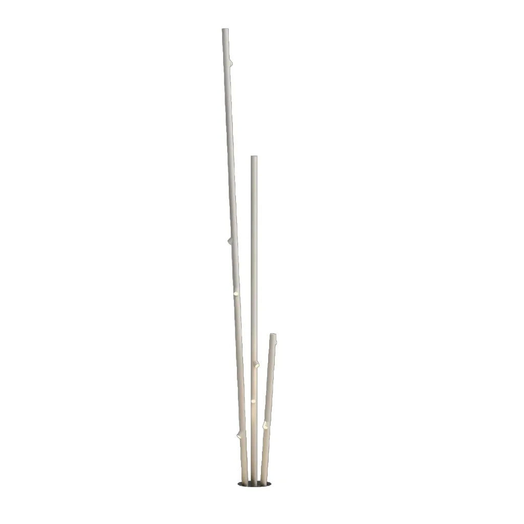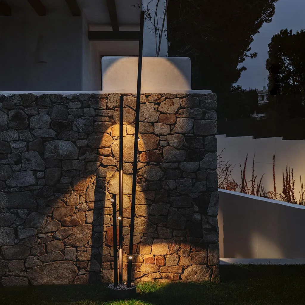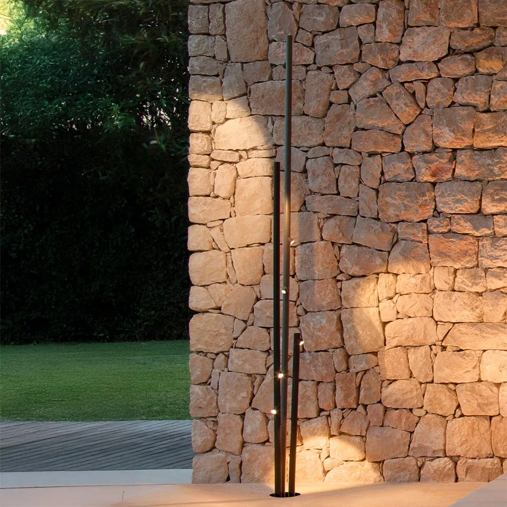 Das minimalistische, von Bambus inspirierten Design integriert sich nahtlos in grüne Außenanlagen und architektonische Landschaften. Die dünnen, röhrenförmigen Leuchtenkörper mit einem Durchmesser von nur 4 cm und unterschiedlich langen Lichtquellen erzeugen eine lebendige, natürliche Optik. Die Mehrfachvarianten mit drei Stäben verstärken diesen Eindruck und wirken wie natürlich gewachsene Pflanzen.