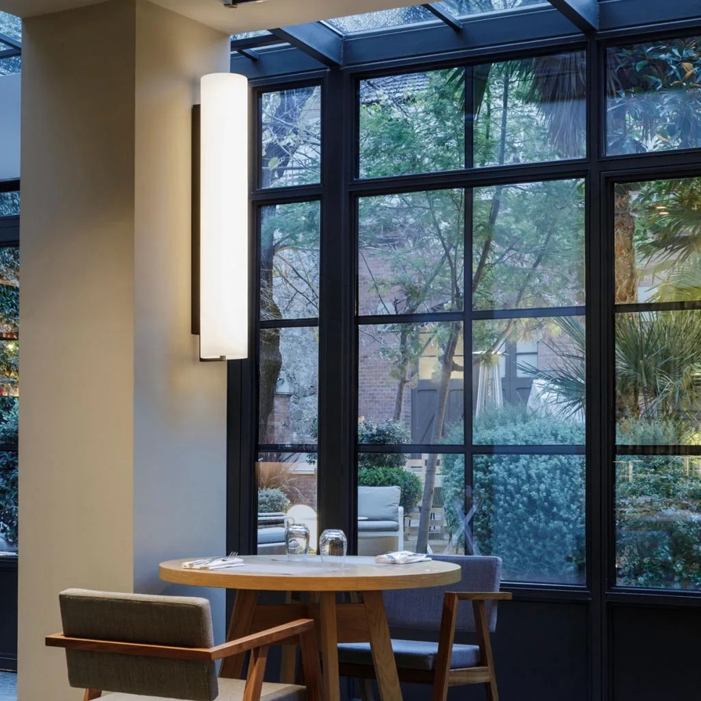 Entworfen von Sebastian Herkner, besticht die Vibia Kontorno 6446 durch ihre grafische Klarheit und filigrane Gestaltung. Ergänzt wird die Leuchte durch einen mundgeblasenen Opalglas-Diffusor, der sich perfekt in die grafische Geometrie der Architektur einfügt. Mit dem zylinderförmigen Glasdiffusor wird eine warme Rundum-Beleuchtung erzeugt. Die im schwarzen Metallrahmen eingebetteten LEDs erzeugen ein blendfreies, diffuses Licht, das den Raum elegant strukturiert und gleichzeitig eine warme, behagliche Beleuchtung bietet.