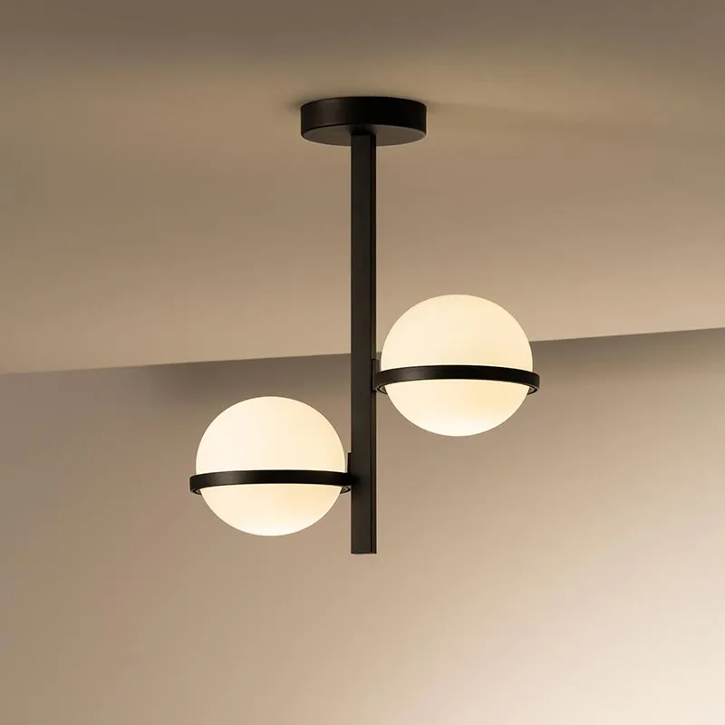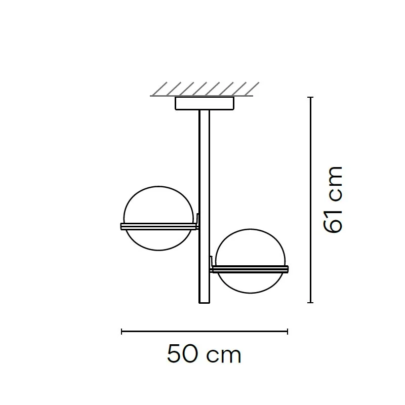 Die Pendelleuchte zeichnet sich durch einen faszinierenden Schwebeeffekt aus, der durch das kaum wahrnehmbare Aufhängungssystem und die einzigartige Kabelführung erzeugt wird. Die Glaskugeln werden von dezenten Ringen umgeben, die diesen schwebenden Eindruck noch verstärken. Die Leuchtkörper sind in verschiedenen Höhen und Winkeln an der vertikalen Achse angebracht, was eine organische Struktur schafft und ein warmes, diffuses Licht in alle Richtungen verströmt.