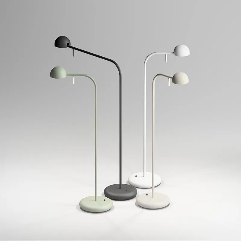 Die puristische Leuchte besteht aus einem kreisrunden Fuß, einem schlanken, gebogenem Stab und einem kleinen Leuchtenkopf, der sich mittels eines Metallstabs in alle Richtungen drehen lässt. Die Pin Tischleuchten 1650 sind in matter Lackierung in den Farben Schwarz, Creme, Weiß und Grün erhältlich. Ein Knopf zum Ein- und Ausschalten der Leuchte befindet sich am Leuchtenfuß.