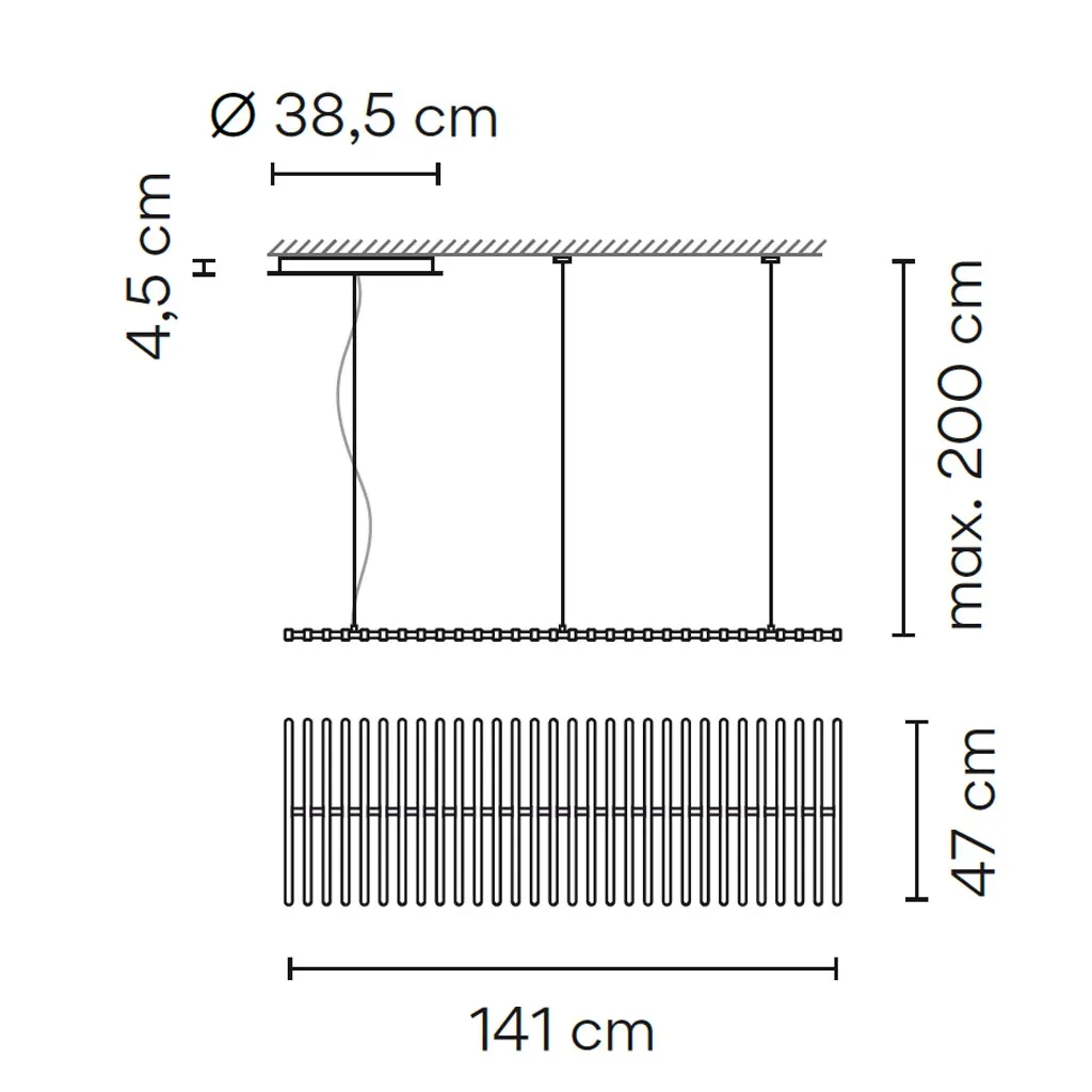 Das nach unten abstrahlende Licht sorgt für eine gleichmäßige, warme Ausleuchtung mit hoher Farbwiedergabe (CRI), ideal für eine angenehme Atmosphäre am Esstisch, im Arbeitsbereich oder über Empfangszonen. Trotz ihrer markanten Gestaltung bleibt die Leuchte durch die schlanken Stäbe und die dezente Aufhängung stets leicht und elegant im Erscheinungsbild.