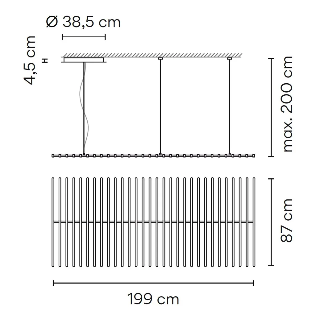 Das filigrane, horizontale Arrangement erzeugt den Eindruck einer frei schwebenden Lichtskulptur, gehalten von einer zentralen Achse und dezenten Drahtseilen. Jeder der schlanken Stäbe aus Polyamid ist mit einem LED-Band und einem Polycarbonat-Diffusor ausgestattet. Durch die Möglichkeit, jeden einzelnen Stick zu drehen, lassen sich wellenartige, lineare oder asymmetrische Formen kreieren – individuell abgestimmt auf Architektur, Möblierung und Raumwirkung.
