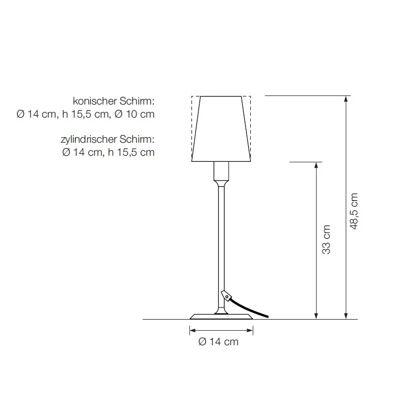 Die Tischleuchte Nostalgia-T wird standardmäßig mit einem geraden Seidenschirm in Weiß geliefert. Möchten Sie die Leuchte mit einem anderen Schirm bestellen, vermerken Sie das bitte bei Ihrer Bestellung im Bereich der Rechnungsdetails unter “Bestellhinweise” oder rufen Sie uns gerne an. Die nachfolgenden Schirme stehen zur Auswahl.